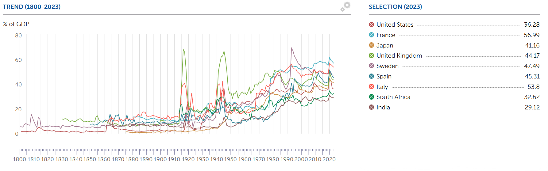 The biggest example of where forced trade reigns supreme is large, modern, democratic governments. All re-allocation of resources by current governments, is trade via force. What happens if you do not pay taxes? Your property is seized and you go to jail. Governments use their monopoly on violence in a given area, to steal the property of individuals living in that area via taxation. This can be done overtly, via income/corporation taxes, or more covertly like fuel taxes or money printing. Whichever way they do it, unless it is a voluntary donation, they are stealing what others have produced via force. They do not have to compete to be the best at serving you to earn your money, they just take it, and waste it. One of the best ways to measure the degree to which this is occurring is looking at government spending as a % of GDP (total spending). If you look at the above chart, this is roughly the degree to which forced trade has overtaken voluntary trade in modern economies. This is why your society is decaying.